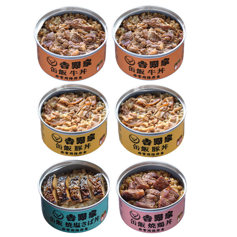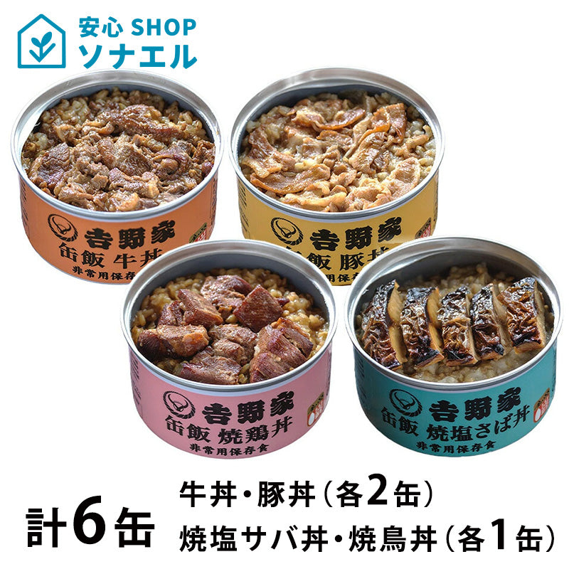 非常用缶飯 牛丼・豚丼(各2缶) 焼塩サバ丼・焼鳥丼(各1缶) 吉野家 3年保存